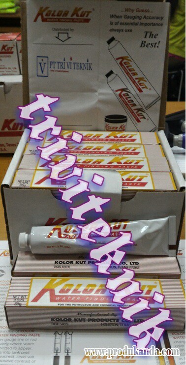 KOLOR KUT WATER FINDING PASTE atau biasa disebut dengan Pasta Air adalah pasta dengan warna cokelat keemasan yang akan berubah merah cemerlang jika ada kontak/terkena dengan air. Produk ini dapat mengukur kadar air dalam semua minyak dan hidrokarbon serta asam sulfat, asam nitrat, asam klorida, amonia, sabun, garam dan klorida lainnya.